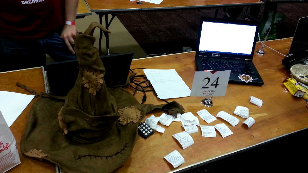 In the end, I worked all through the night on the project, finally collapsing around quarter of 8 in the morning for about an hour. This is the point where I gave up trying to use BlueTooth and switched to serial USB communication instead. (I think the board just had too many serial in/outs going at once. I will look into this problem more later.) Hacking ended at 12pm, at which point I had finished all I could do and took a quick half hour nap. The “science fair”, as HackRU called it, began at about 2pm. It was quite crowded as everyone gathered at his/her assigned tables to show off the projects. Josh and I did pretty well in our seemingly endless presentations of sorting hat. (Aside: socializing with/selling your project to hundreds of strangers on one hour of sleep is awful.) Everyone was quite amused by the app ideas that the hat generated.